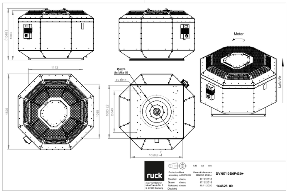 | Design | Ruck roof fan for conveying hot / greasy air, fire resistance class F400 |
